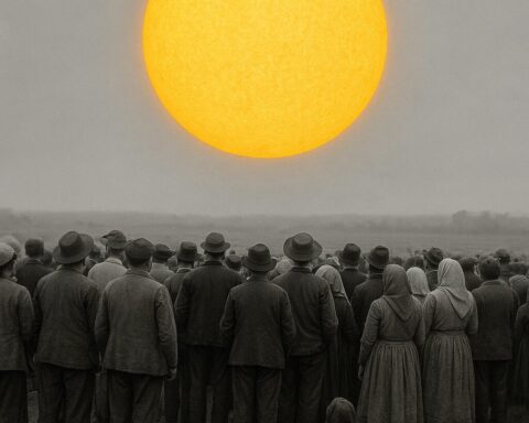 Era il 13 ottobre 1917. Il cielo sopra Fatima era un tappeto di pioggia e fango, eppure una folla immensa, tra 30.000 e 70.000 persone, attendeva in silenzio. Donne con i rosari stretti fra le dita, uomini con il cappello calato sugli occhi, bambini che tremavano di freddo. Tutti con lo sguardo rivolto verso il cielo, dove -dicevano- sarebbe dovuto apparire un segno. Poi accadde. Le nuvole si aprirono, e il sole cominciò a muoversi. Ruotava, vibrava, si colorava di rosso e di viola, quasi come se danzasse. Per un istante sembrò precipitare verso la folla, che si inginocchiò, pregando…