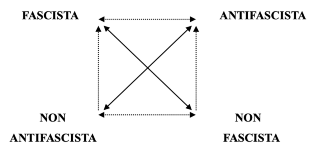 La negazione dei primi due poli (“Non-Fascista” e “Non-Antifascista”) non è un semplice “né… né…”, ma rappresenta posizioni ideologiche distinte, che sfuggono alla polarità classica fascismo/antifascismo .