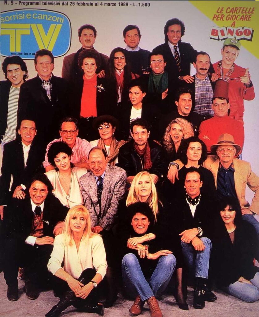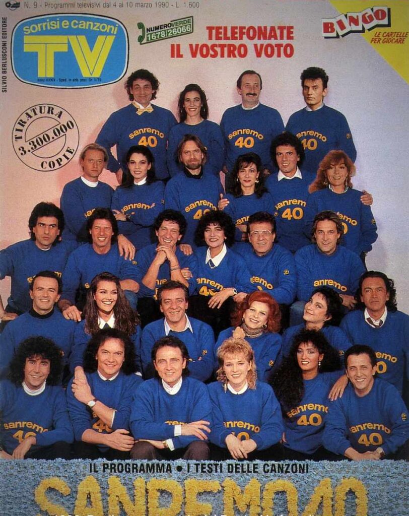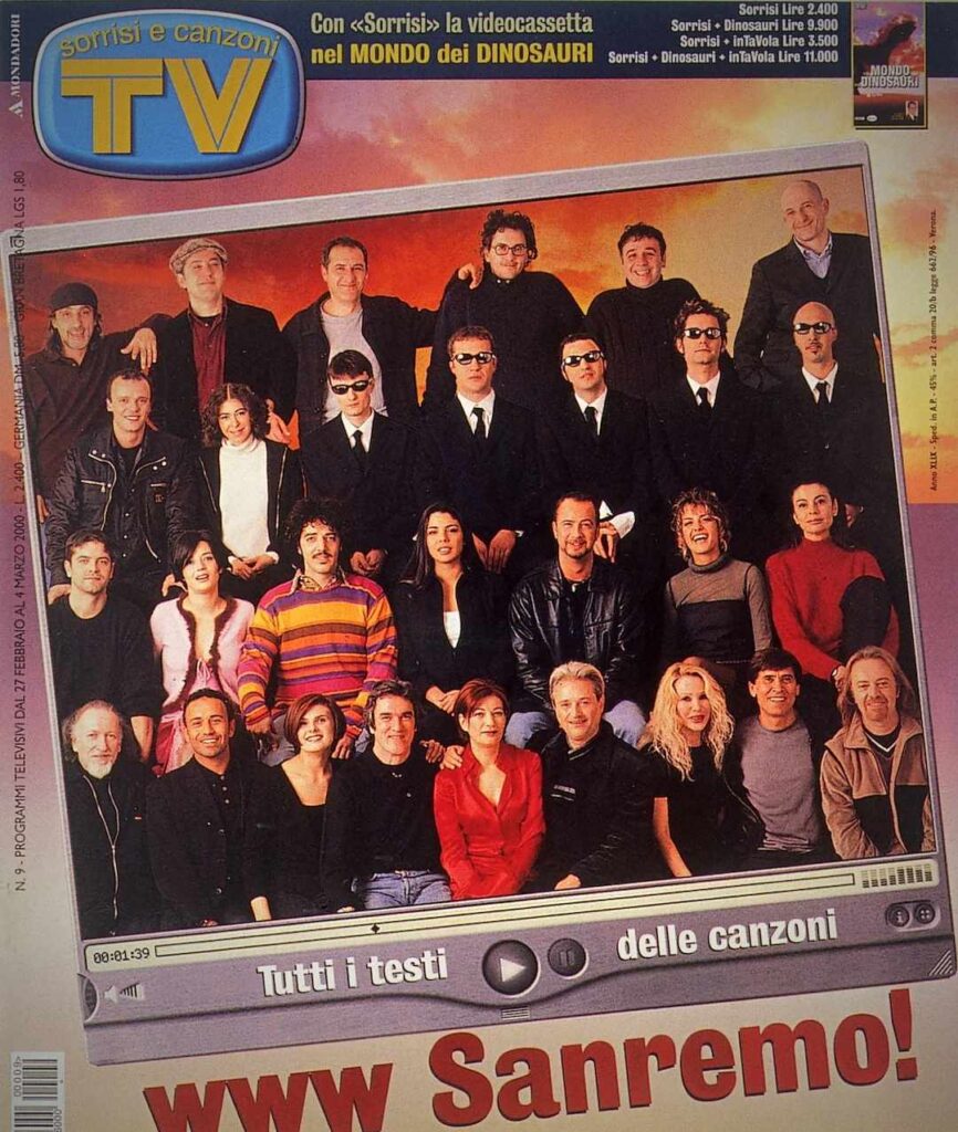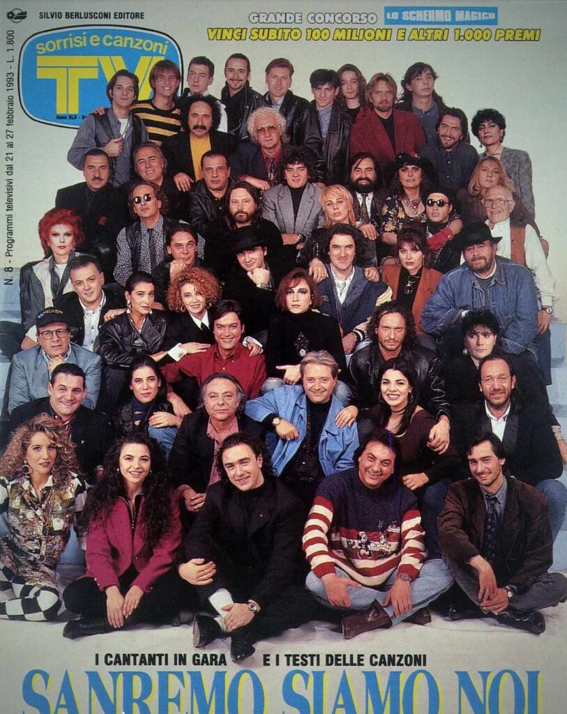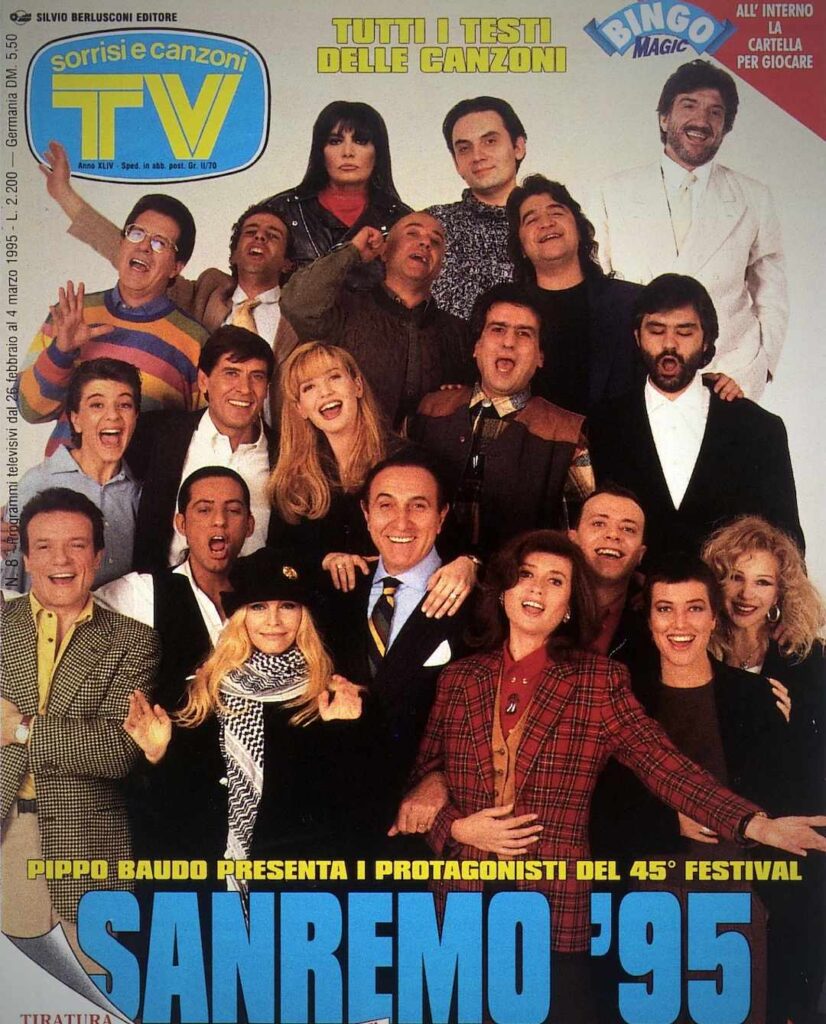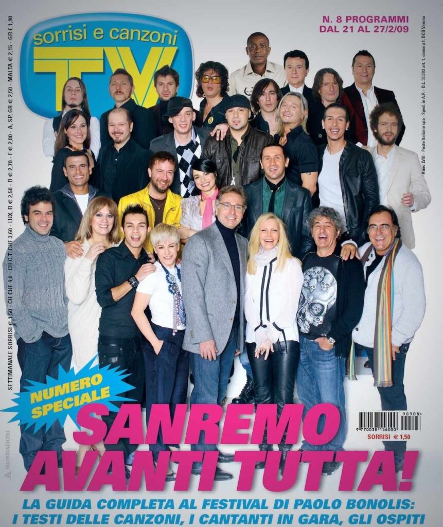 Ripercorrendo la storia delle varie copertine, però, si nota come queste siano cambiate negli anni, seguendo l’evoluzione della televisione e della fotografia. Negli anni ’80 e ’90 le immagini erano più spontanee e affollate. Basti pensare a quella del 1993, quando in copertina comparivano ben 49 artisti, con un effetto quasi caotico ma incredibilmente vivo. Memorabile anche la copertina del 1995, con Pippo Baudo al centro di un cast d’eccezione che comprendeva Giorgia, Laura Pausini e Andrea Bocelli, tutti ancora all’inizio delle loro straordinarie carriere.